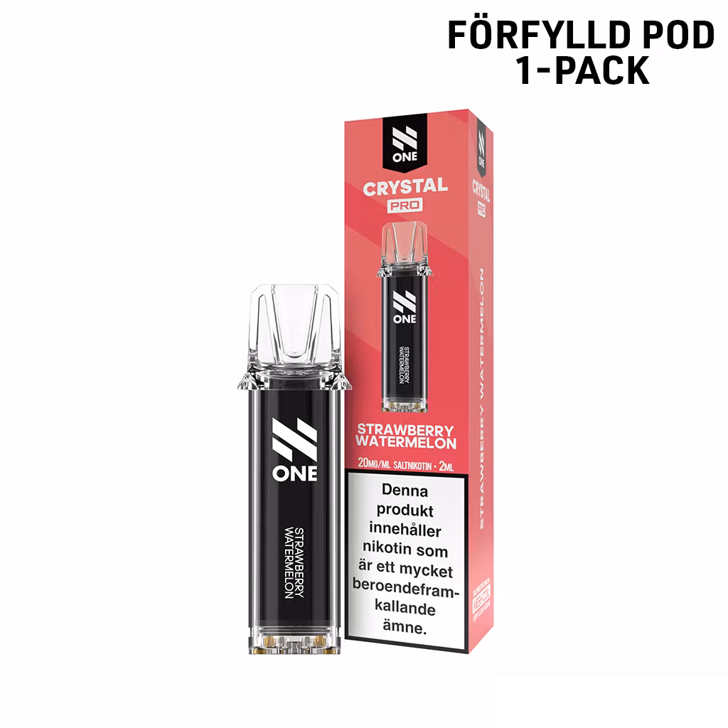 N One Crystal PRO Pod – Strawberry Watermelon 20 mg är en förfylld pod med 20 mg nikotinsalt som kombinerar solmogen jordgubb med frisk och saftig vattenmelon. Smaken är fruktig, rund och perfekt balanserad mellan sötma och lätt friskhet, vilket ger en mjuk och behaglig vape-upplevelse hela dagen. Nikotinsaltet ger en mjuk halskänsla och snabb nikotineffekt, medan mesh coil-tekniken säkerställer jämn och tydlig smakleverans från första till sista puffen.