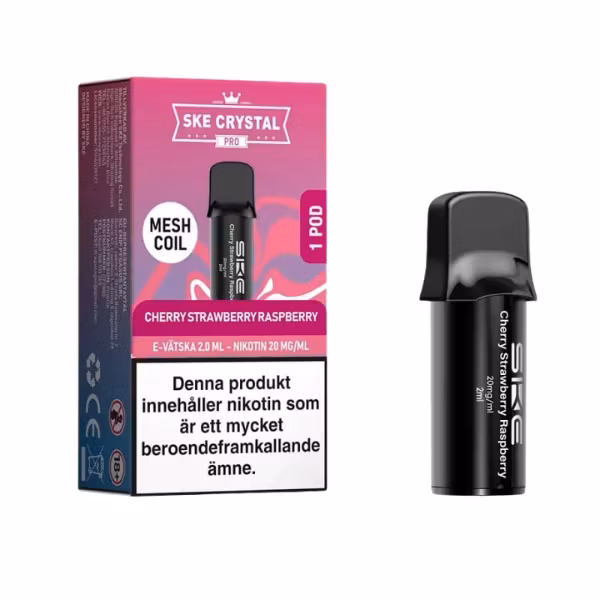 SKE Crystal Plus Max – Cherry Strawberry Raspberry är förfyllda poddar med 20 mg nikotinsalt som kombinerar tre klassiska bär i en intensiv och välbalanserad smakprofil. Djup och fruktig körsbär möter söt, saftig jordgubb och frisk hallon, vilket skapar en rik och livlig bärmix med lång eftersmak. Nikotinsaltet ger en mjuk halskänsla och snabb nikotineffekt, medan poddarna är optimerade för jämn och stabil smakleverans tillsammans med SKE Crystal Plus Max-batterier.