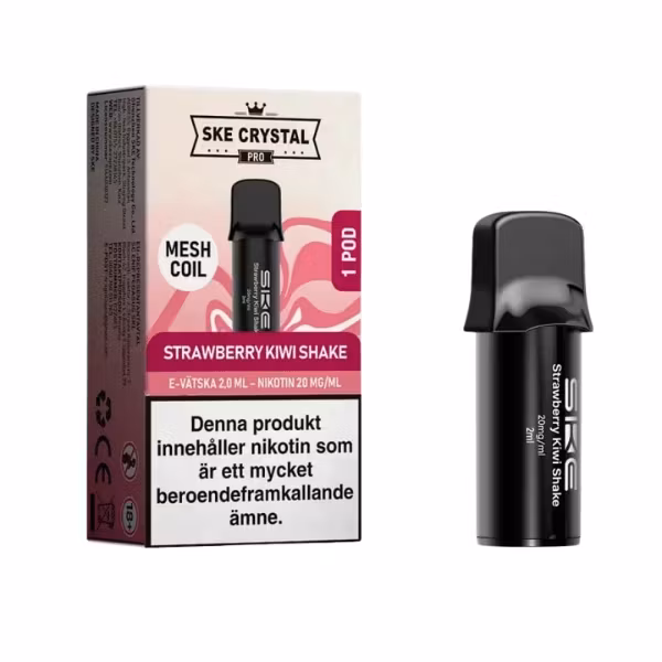 SKE Crystal Plus Max – Strawberry Kiwi Shake är förfyllda poddar med 20 mg nikotinsalt som kombinerar söt, saftig jordgubb med frisk kiwi och en mjuk, krämig shake-ton. Resultatet är en rund, len och välbalanserad smakprofil som känns fyllig utan att bli tung. Nikotinsaltet ger en mjuk halskänsla och snabb nikotineffekt, medan poddarna är optimerade för jämn och stabil smakleverans tillsammans med SKE Crystal Plus Max-batterier.