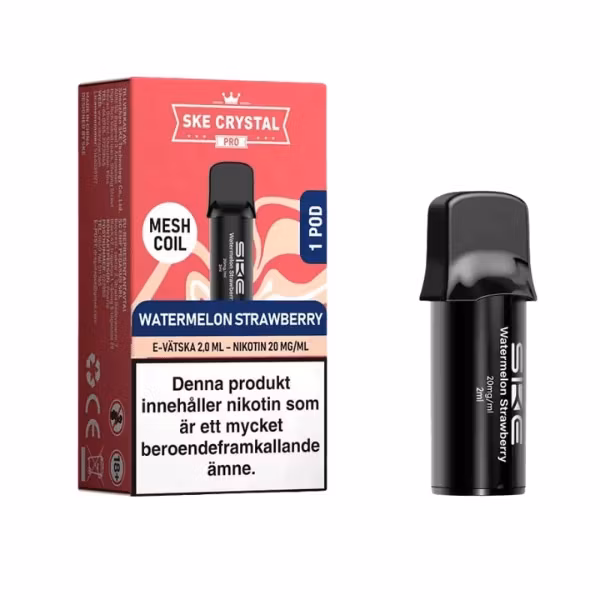 SKE Crystal Plus Max – Watermelon Strawberry är förfyllda poddar med 20 mg nikotinsalt som kombinerar frisk, saftig vattenmelon med söt och solmogen jordgubb. Smakprofilen är lätt, fruktig och mycket lättdrucken – perfekt för dig som gillar rena fruktsmaker med naturlig sötma. Nikotinsaltet ger en mjuk halskänsla och snabb nikotineffekt, medan poddarna är optimerade för jämn och stabil smakleverans tillsammans med SKE Crystal Plus Max-batterier.